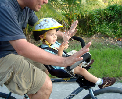 Since we were up and ready to go early enough to get breakfast before eleven, we went to Sanibel Bean. The bagels were nothing fancy, but the coffee was great. And the photos on the walls of people holding I heart The Bean bumper stickers all over the world were so cute that I wanted to send one in, too (but the feeling passed). Riding back home from Sanibel Bean, some old dude took a look at Dan and said, “Bad idea, dude.” I think he didn’t notice the bike seat and assumed Brandt was sitting on the top tube. Dan thinks he was commenting on Brandt’s outfit of red hawaiian shorts (Dan doesn’t like ’em) with blue t-shirt and yellow bike helmet.