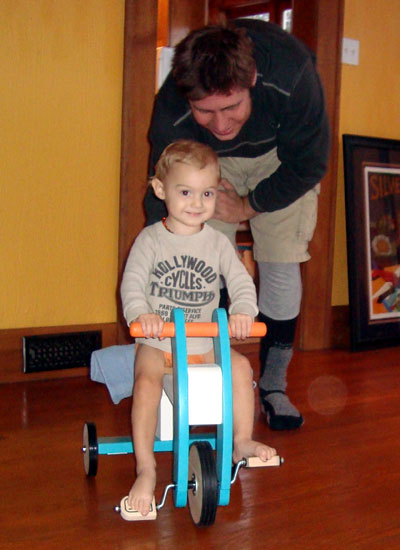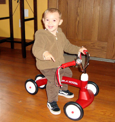 It’s snowing so we had a white Christmas today. Delivery trucks have been stranded all over town, but luckily the bike I ordered came. It’s a little too big for Brandt (I just noticed it’s for ages three and up, oops!), but he seems ready for pedals and Dan rolled up a towel so he could sit far enough forward to reach them. It’s the Plan Toys Wooden Trike and it was 60% off and while it’s very cute, it hasn’t got much of a turning radius and it doesn’t pedal very easily.