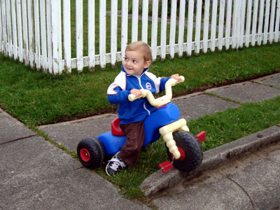 I took advantage of the situation and napped much of the day while Dan and Brandt did who knows what. And I got a little outdoor time, too, taking Brandt for rides on his new (free!) bike at 7am and 4pm, in between rain showers. He doesn’t pedal yet, but he tries to now and again. And he loves pushing his way over obstacles, like the two cement curbs in the neighbor’s driveway. He loves this bike so (too) much that I’ve taken to leaving and entering the house through the back door so he doesn’t see the thing and insist on riding it.