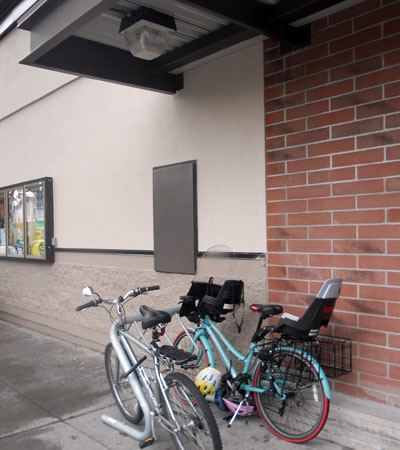 Anyhow, the highlight of the trip is that I discovered a covered bike rack across the street at the QFC. It’s so nice to get back to a bike with the seats still dry. I hadn’t been upstairs QFC since the remodel and the Starbucks has a lot of nice seating. Not sure how long the kids would hang out there happily, but it seems like a good rainy day stop.