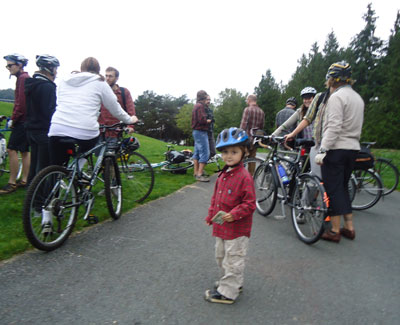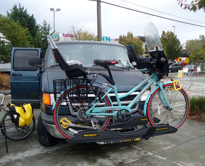 We attended the Sustainable Ballard Festival today, first to volunteer for an hour at the CoolMom carseat recycling station, then to try the practice bus bike rack affixed to the front of a van. I tried twice, once as the first bike on and once as the second bike on…and I fit, Bobikes and all! But it is tiring work hefting the bike up there, and I’m not sure it’d go as well getting in the second or third slot with the baby on my back. But good to know for in-case-of-emergency situations.