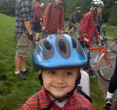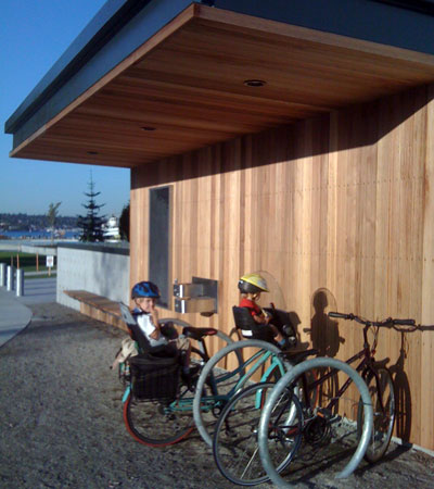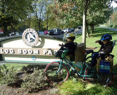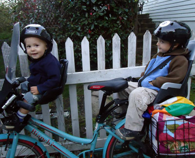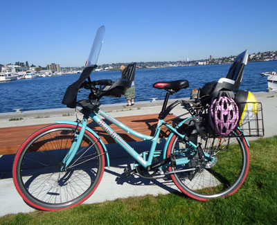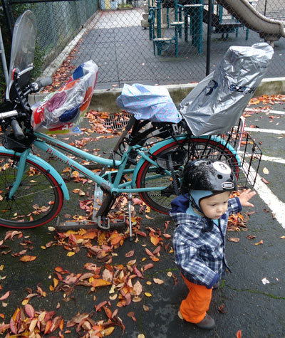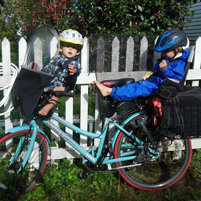 The kids were hungry by the end of the afternoon, but between the big one tossing his rainboot sole inserts down a storm drain and the little one discovering puddles for the first time and therefore riding home with no pants on, we weren’t exactly cafe-friendly. Plus I didn’t want to deal with de- and re-biking so we rolled into Dutch Bike Co. for a snack on wheels. So convenient! And as luck would have it, Fritz showed up while we were there so I showed him my rubbing fender which he promptly fixed permanently, with zip ties. Black ones, so the work doesn’t even show. I mentioned to him my bright idea to turn the Milano into an Xtracycle, but he warned me it might not work with all its parts, such as my pretty Celeste Green rear fender. So there goes that idea. Not to mention an Xtracycle wouldn’t fit on a Metro bus.