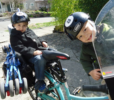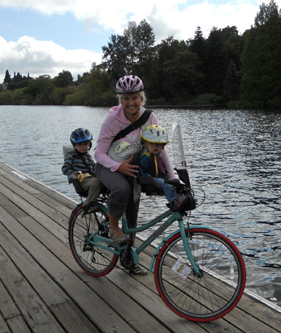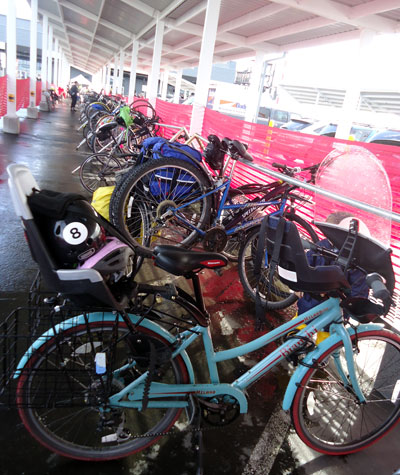The day didn’t start off smoothly. One great thing about the RainMan is that the heats start all through the day, rather than super early in the morning like a real triathlon. I chose a reasonable start time and figured I could easily get there the required hour early. Of all the days to rely on the kids to wake me up, no one woke up at the usual 7:30am. Instead, I woke up to a quiet house at 8:10, 30 minutes before my show time. This would have been fine if I just had to get myself there, but I had planned to ride over with both kids in the double trailer behind my road bike and let my husband could come along a bit later. The big kid refused to get up so I ended up just bringing the little kid with me. This threw everything off because we’d only made the one trailer accessible in our recent move so the stragglers would have to come by car and I didn’t expect them to find easy parking. I wasn’t quite an hour early, but I still had plenty of time to get checked in and pace around impatiently. I didn’t need to do any warming up, but I had hoped to have time to drink some water and get my hair wet. Instead I nursed the baby for twenty minutes right before my heat (that’s anti-hydrating!) and left my hair dry so I wouldn’t freeze while waiting barefoot on the curb. They pulled up two minutes before my heat so I tossed the baby into the car and ran inside. Phew!
