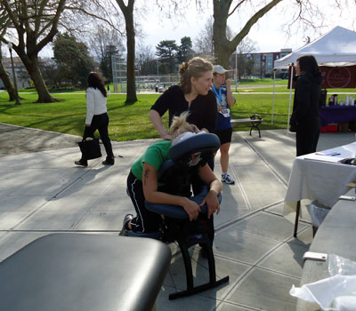 The after-party was better this year than last. I got a free posture evaluation: I slouch and I’m crooked. Hopefully the free chair massage evened me out a bit. And Makeda Coffee was a sponsor–yum! Everyone got a medal. The kids immediately commandeered mine.