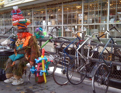 I didn’t notice any bike racks right at PPM so we parked a bit up the hill on Pine. I like this fine because it allows for great photos with the Public Market sign in the background and it’s partially up the too-steep hill so it was easy to unlock and walk the bike up to 1st Avenue before sticking the kids on. Later I noticed a lot of bikes parked at the bottom of Pike Street. I don’t know if it’s just a Seattle phenomenon, but I see bikes parked in elevated positions all the time. Here it was just the top wheel up over the fence. I don’t know if the balloon clown was guarding the bikes or just happened to be working the same spot. Either way, I like it and will try to park there next time.
