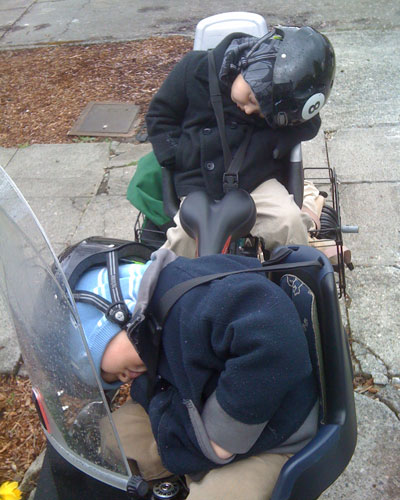 It took me 38 minutes to reach the park which put me 11 minutes late, but the Spokespeople were still there so I joined them for the first time. It started raining as soon as we set out and I entertained thoughts of ditching the ride, but the rain let up and we had a lovely trek over to the Ballard Locks. We headed down Densmore, which is a great mellow street. We took Densmore on the way home, too, and I was able to pedal all the way up…but I think that was only due to Michael and another rider pacing me up the hill. I’m pretty sure I won’t make it when I try alone. The whole ride was a bit faster than my normal pace, but it was all fun. The boys both fell asleep on the way up Densmore. I don’t know why they were so tired!