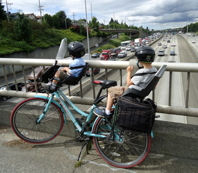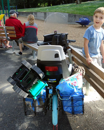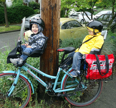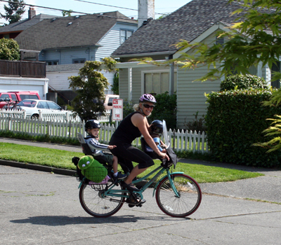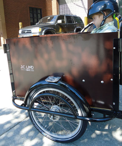 The step plates over the front fenders are very cool and there’s also an option to get a door on the front of the bike for passengers not big enough (or human enough–it’s called the doggie door) to reach the platforms. You might notice the toddler hand smudges on the shiny wood. I should have kept a moist cloth handy to keep it looking pretty. The exciting new optional frame colors (Fire Red, Orange, Royal Blue, Apple Green) probably work to distract from smudgy wood, though.