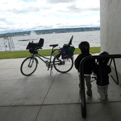 We visited J.C. Lind Bike Co. in Old Town Chicago to rent a cargo bike for the day. I figured I’d want to take out the Winther Wallaroo, a super-fancy Danish cargo bike, especially after reading the Let’s Go Ride A Bike review of its three-wheeled counterpart, the Kangaroo. I was a little intimidated by its adjustable seats (front facing, rear facing, fully reclining, oh my!)–were we dressed well enough to even be in the same room as this beauty queen? After test riding it in a parking lot near the shop, however, I was more intimidated by its handling. The Wallaroo is long! And therefore hard to manipulate. I’m sure I could get the hang of it given more practice, but I swallowed my two-wheel pride and it didn’t take much convincing on Jon Lind’s part for me to take out the J.C. Lind Triple Lindy.