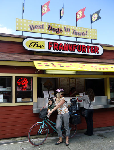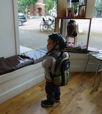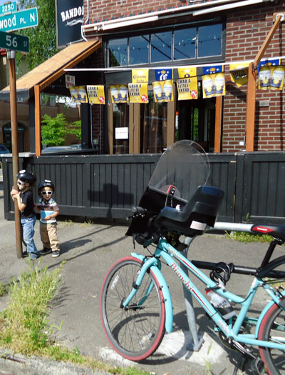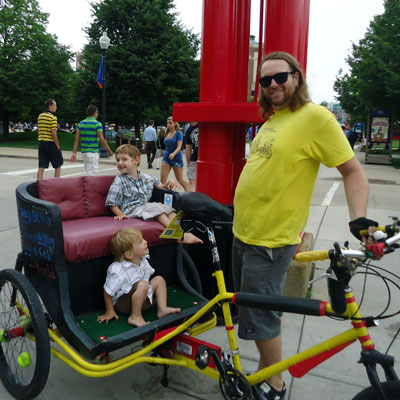 The shop is great, too, by the way. The boys enjoyed running around on the rubber floor mats, made from Schwalbe recycled tires. I was quite taken by the accessories wall and after hearing the melodies played by Jimbob Love on his many pedicab bells the other day and the ice cream trike today, I got a bell. I got one similar to the Triple Lindy’s bell so we could think back fondly on today if ever we get a chance to “on your left ding dong” anyone.