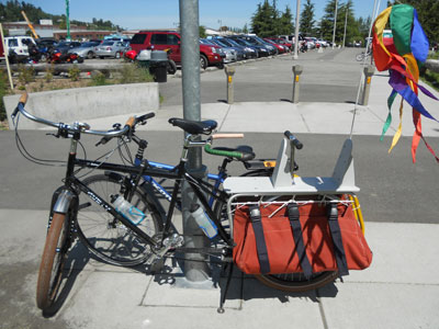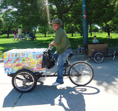 The Triple Lindy is a really nice trike and I got a lot of shouts and smiles on the lakefront bike path. The frames are produced in the Netherlands, which I think is a selling point, but Jon was proud to report that at some point they’ll be made locally in Chicago. All other parts are made in Chicago and I’m pretty sure we rode by the mechanic who assembles them because I heard a guy say to his companion “Hey! Those are the bikes I build.” It has a lot of great features, including an optional rain canopy, you can check out on the website.