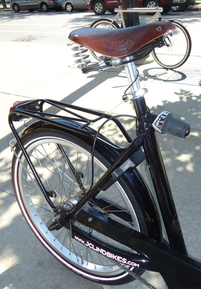 The only weird thing was the placement of the shifter. It’s on the seat post–something to do with cables of only two feet being available until recently. Jon mentioned they might change its location, which I hope they do because it was awkward to reach down between my lets to change gears. And I imagine it’d be near impossible to do so while wearing a shirt, for those fancy moms and dog schleppers. It was nice having foot brakes and the hand brake, but the position of the hand break in the middle of the handlebar took some getting used to. I forgot to ask why it’s in the middle.