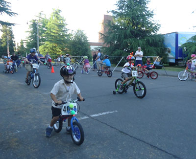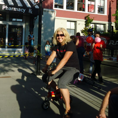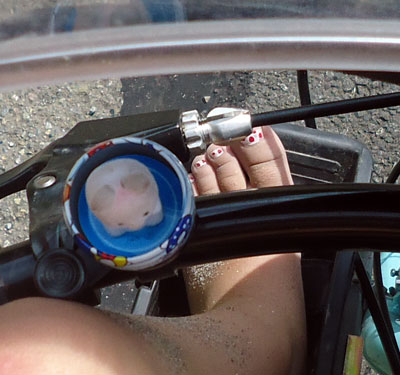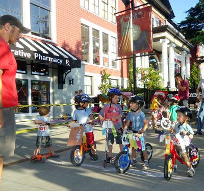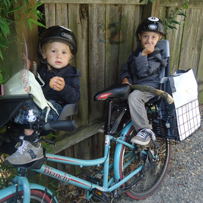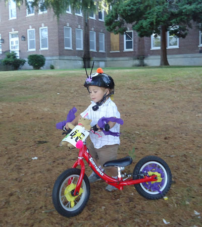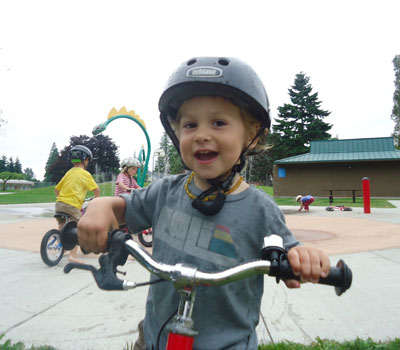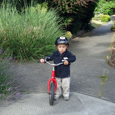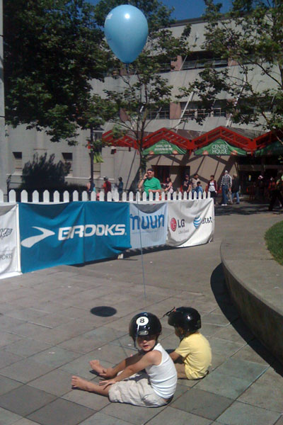 The boys got free wooden Seafair hydroplane boats and balloons. I’ve avoided balloons in the past, apologizing “We’re on the bike and can’t possibly transport it home.” But they got their tiny paws on yesterday’s balloons before I could intercept them. The little guy liberated his balloon within three minutes and the big guy didn’t want his tied to his wrist so we compromised by tying it to his helmet. I worked quite well! I left it long while we were walking around, but shortened the string before we rode off to our next destination.