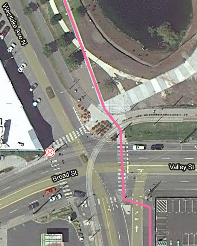 A friend drove up from Oregon and brought her road bike along per my suggestion. Yesterday we took her on a tour of our favorite spots of late, starting with the Seattle Center. I think this wouldn’t be a favorite spot of mine if not for having the bike along, since it’s so big with so many spots of interest. We started out at the International Fountain, but it was a bit crowded so we zoomed over to the DuPen Fountain for a quick dip. The whole place was a bit crowded for comfort (I had checked for big events, but the website failed to mention Hispanic Seafair Festival, which was huge) so we grabbed food at the Center House and then returned to the DuPen for swimming and eating.