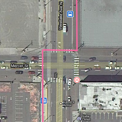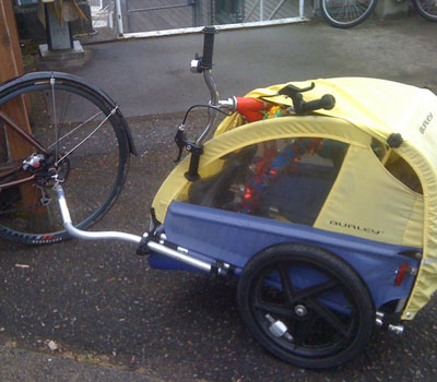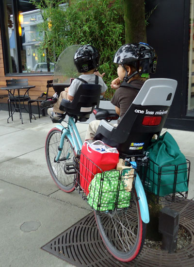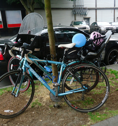 After yesterday’s gorgeous day, today was cold and rainy. I wasn’t too cold, given my sixty pounds of bonus weight and baby fairing, but my poor friend was cold even in her sweater. Today we biked to Ballard for blunch (their term, not mine) at The High-Life which we decided upon yesterday, thinking we’d be able to dine al fresco–ha ha. But it was nice and warm inside, away from the drizzle. Then we took our bikes to Second Ascent New and Used Outdoor Gear so my friend could look into affordable rack and panniers to do some bicycle touring. Turns out her sweet little road bike is too cute and delicate to do any heavy hauling. My bike tried not to look smug as the mechanic broke the bad news.