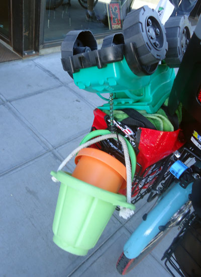 We may have left Second Ascent empty handed, but my friend cleaned up at the farmers market. She had expected to carry a bunch of produce home in her new panniers, but I had room in my baskets. This time I had to walk a block and a half on the way home–not due to the groceries, but because all that time in the sun yesterday wiped me out. We took a nap as soon as my friend left for her big drive home.