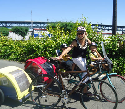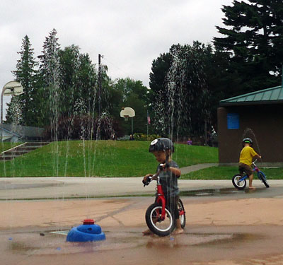 Next up was South Lake Union Park where the big people chilled at the shady table while the little people frolicked in the spray park. We also ran up and down the grassy hills and floated the wooden hydroplanes in the model boat pond. We took the short and steep route home and naturally my seriously-have-never-met-anyone-in-better-shape friend had no trouble and kindly offered to trade bikes with me, but I waved her off and walked the worst half block. I should have thought to weigh her down with a trailer full of bricks to level the playing field.