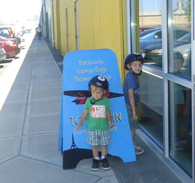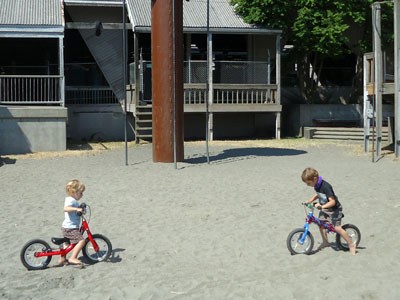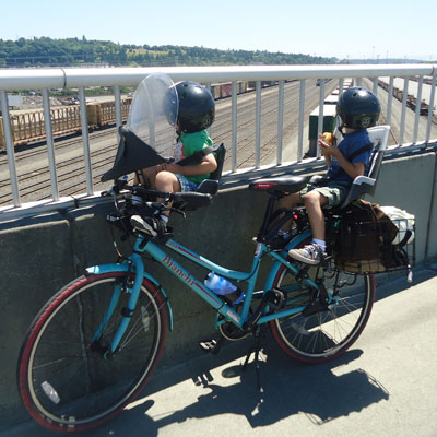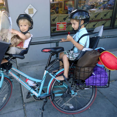 The Children’s Museum was great today–the new Lego exhibit isn’t much to look at, but the kids and their friends stayed in there for hours. Afterwards we swung by the International Fountain, which we’ve had to avoid for almost a year (“Too loud, too fountainy!”) and it was nice to see it’s no longer too loud and fountainy, but I was stuck with two wet kids. However, it’s nicer to put wet kids on a bike than in a car so we happily rode home–down Denny, along the trainyard, and through the locks. We stopped in at Me ‘N Moms, the kiddie consignment store by the locks so the second half of our ride home could be dry. I wanted to stop in at Dutch Bike Co after reading this Seattle Weekly article about the cafe and I didn’t want to drip all over the floor.
