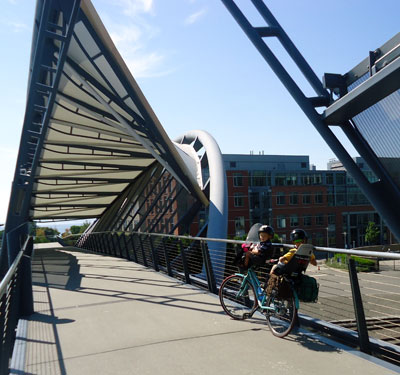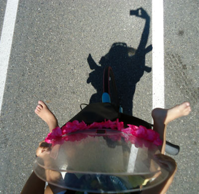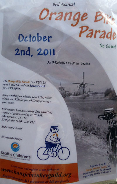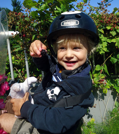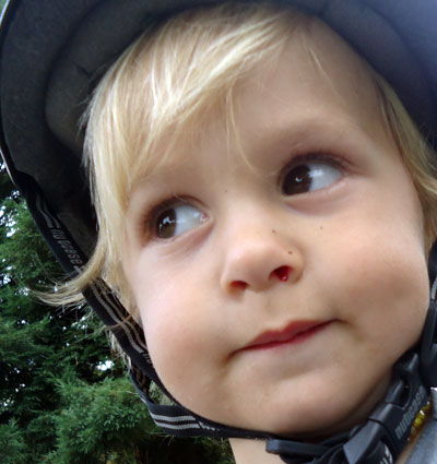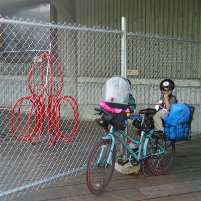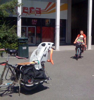 I eventually recuperated from “bonked” to “exhausted” and we headed home. We took the easy way up Stone because I didn’t trust myself to take the steep route which requires dismounting to walk half a block. I thought I might abandon the bike if that happened. While huffing and puffing up Stone I saw a dad with trailer bombing down the other direction…riding with no hands…taking his helmet off his head and adjusting it down in his lap. What?!? I know a trailer is a different beast than an attached kid seat, but come on!