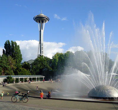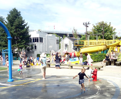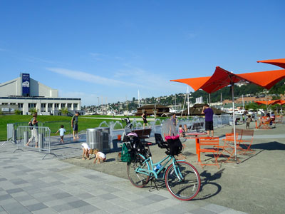 Seashell park was a bust. I’m not sure what the problem was, but apparently the water doesn’t spray out of the shells the right direction. So we decided we’d head over to South Lake Union Park for its properly-angled sprayers, but first we stopped for to-go sandwiches because all the unexpected biking was taking a toll on me. I’m not sure if bonk is the proper term for a recreational bike rider to use or if it’s reserved for real cyclists, but I bonked. So I hid in the shade at SLUP with my sandwich and juice while the monkeys went wild in the spray park. I blame the crap music earlier in the day for this, too. I don’t know why, but it’s all their fault.