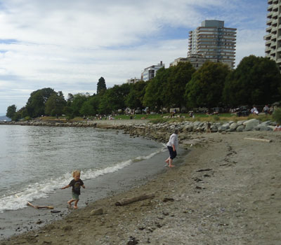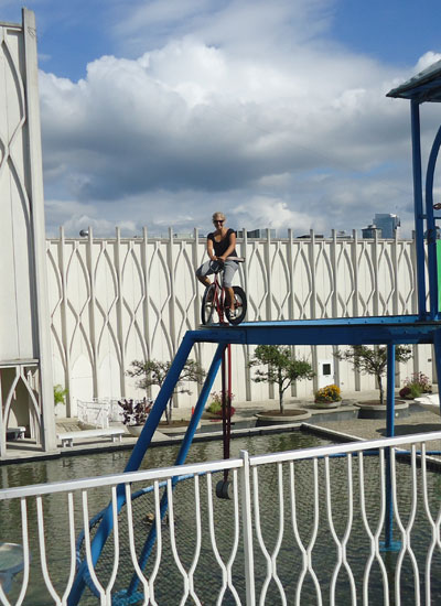 The day had started out incredibly foggy–we couldn’t even see the huge fishing boats close to the bike path. Fortunately, The Little Mermaid medley chased the fog (and us) away and it started feeling like spray park weather. Since our day felt suddenly very open, having planned to spend couple hours at Waterfront Park, we did a bit of exploring on the way back and discovered the elevator at the Helix Bridge. We admired the train tracks from above for a bit and then headed back down and onward to seashell park via the locks.