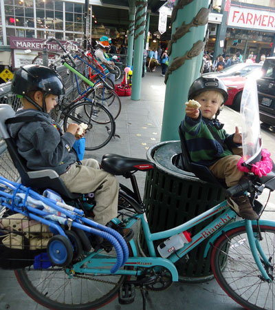 We took our time getting to the concert, starting with utilizing the bike as a stroller and walking a few blocks to a cafe with Mr. Familyride, who is recuperating from a broken shoulder and off the bike for a bit. In Ballard we stopped in at Dutch Bike Co. where Fritz diagnosed my slipping gear problem as “little feet.” Apparently my front passenger has been knocking the cable out of the eyelet. I tried to leave without fruit, but my passengers hollered at me until we went back for apple and banana. Nevermind we were a block away from the Ballard Farmers Market, which was our next stop, for honey sticks.