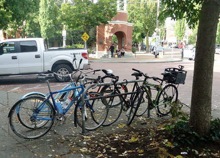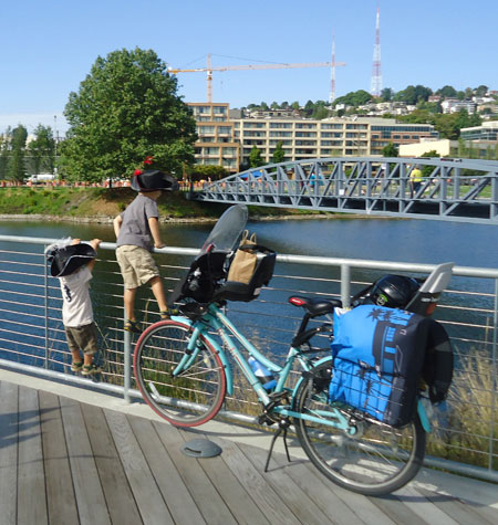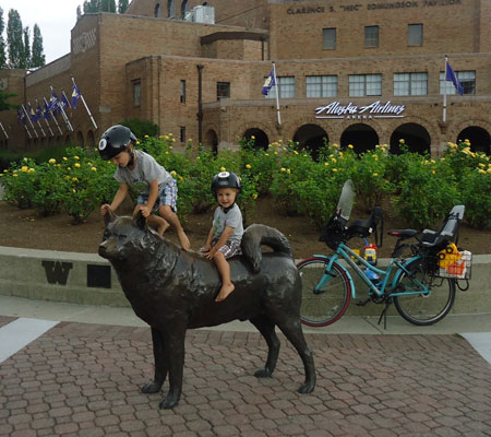 I had forgotten about the filming detour so we took a side trip by the UW husky statue while trying to find our way back to the Burke-Gilman Trail. The detour-sign holders weren’t very helpful and most people carried their bikes up a flight of stairs. We found a pedestrian bridge with ramp just past the doggie statue. On the way home I ran into a friend with trailer who was practically in tears over having been turned back at two points trying to get through the closure. Thank goodness it was the last day of filming. I’m boycotting the movie over the mayhem it’s caused.