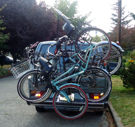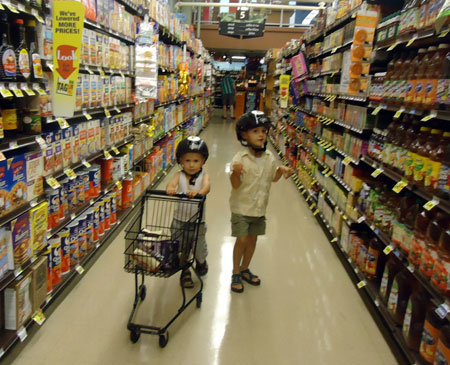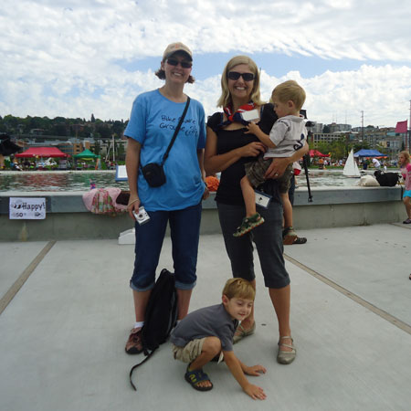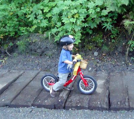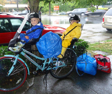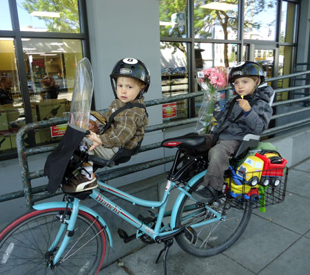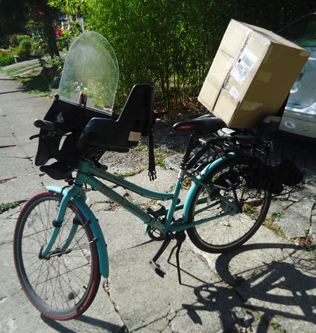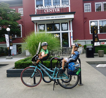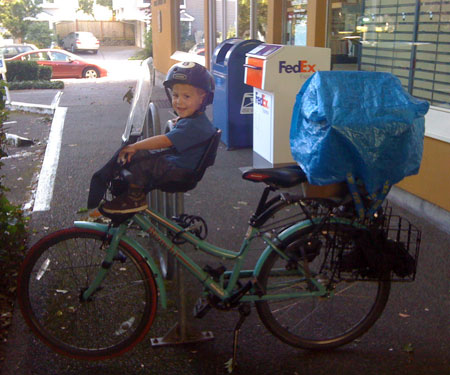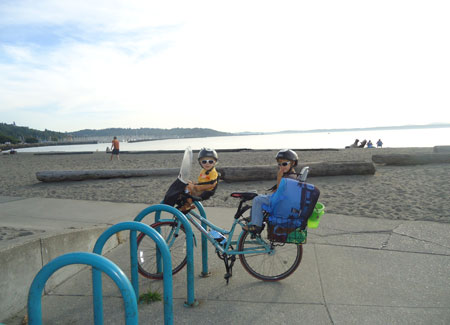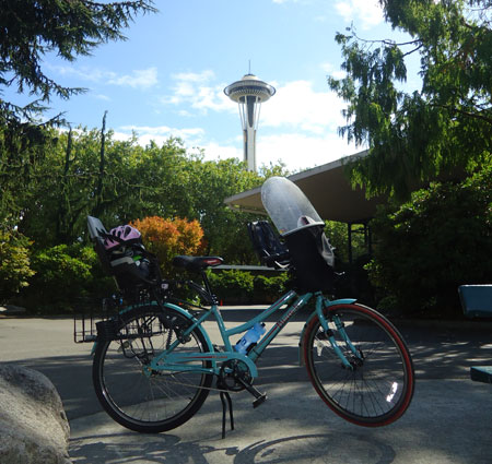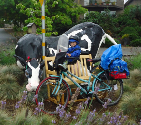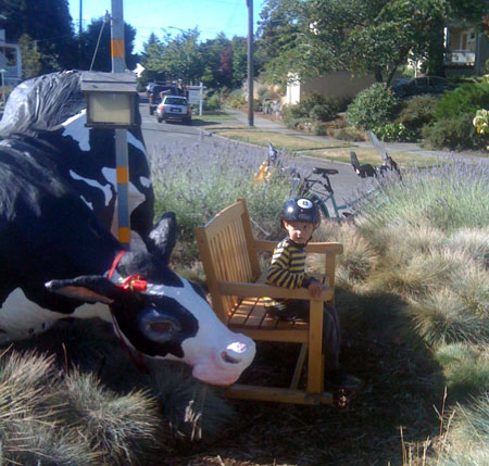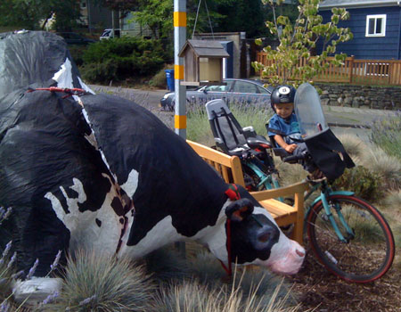 I wanted to do something big today to commemorate the end of the month, but our day started out on a very low note when my very first bike passenger, Lyle, The Greatest Chihuahua of All Time, bid farewell to this world after 18 years of being the very best pet, friend, and sometimes-accessory a gal could have. So my first trip was a car drive to the vet. Then the kids and I biked to nearby Green Lake playground (and on the way we circled the traffic circle cow a couple times, naturally) and then onward to the U-Village shopping center to pick up a copy of The Tenth Good Thing About Barney.