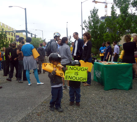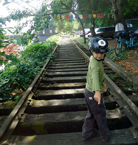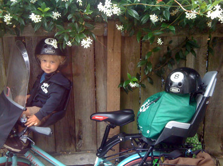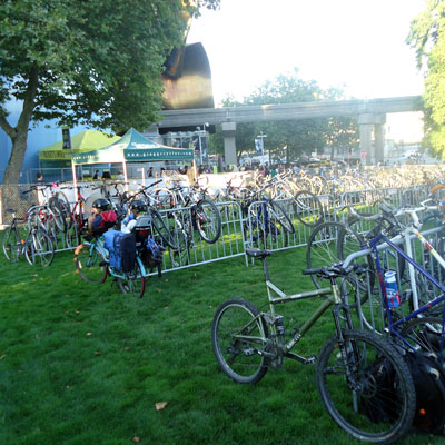 I had a glimpse of our multi-bike future today when I had to use two locks to secure my bike, two balance bikes, and the trailer. I’ve lugged the trailer of balance bikes around quite a bit lately, but never somewhere I wouldn’t be close enough to the locked bike that I was worried about the trailer. This was also the first time the balance bikes stayed in the trailer at a first stop. I’m sure the Wallingford Wurst Festival isn’t a hotbed of crime, but it attracts a lot of people and I wouldn’t be within sight of my bike most of the time.