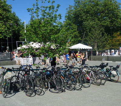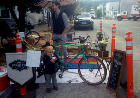 All bounce housed out, I slowly unlocked my very secure bike and we headed to a bike-themed birthday party in the empty Green Lake wading pool. Little girl bikes are so cute! Here’s the birthday girl’s balance bike with her brand new basket and tassels.