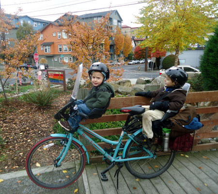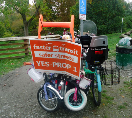 Adequate bike parking is great, but inadequate bike parking can be an invitation to park right out front. The Paramount Theatre’s website doesn’t mention bike parking, but I didn’t have high hopes as we headed downtown for the Yo Gabba Gabba show. A twitter query about parking yielded a few “I locked up to a chain-link fence”s and The VeloBusDriver’s great suggestion to use the bike rack across the street in the Convention Place Station.