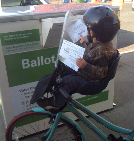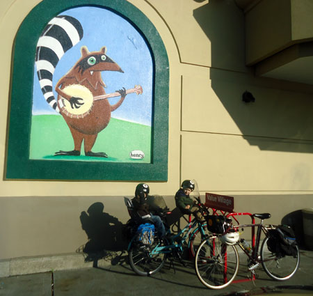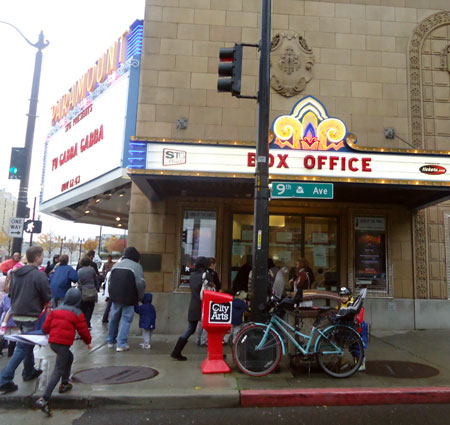 That was my plan, but we were running a little late and usually taking the bike means I don’t have to walk a block at two-year-old-leg speed. So instead I locked up to a trash can by the box office. The bulk of the foot traffic was around the corner at the entrance and there was ample room on the curb side of the bin that the pokey bike parts were shielded from kids walking by on the sidewalk. Win-win.