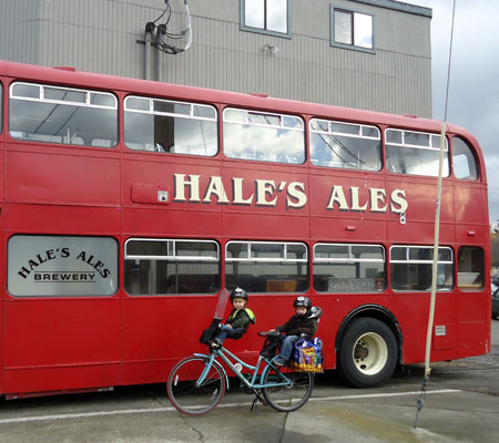 We headed up the Sockeye Salmon Street (you may translate SE Salmon St. as Southeast, but the boys insisted upon Sockeye) Neighborhood Greenway to Inn Beervana, my brother’s friend’s beer-themed vacation rental. Salmon was a nice quiet street and we saw a great bikey house on it–with bike wheels decorating several surfaces–but it was hardly the flat route I’d imagined. The parts of Portland we rode through weren’t hilly like Seattle, but they weren’t completely flat, either.