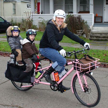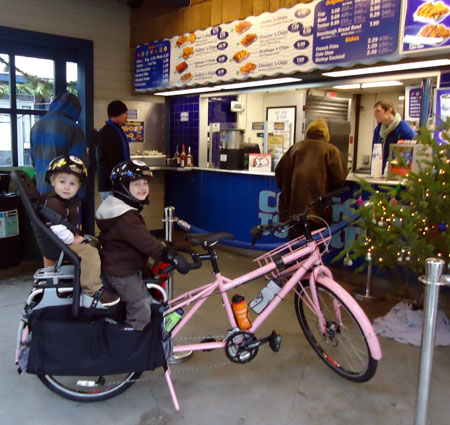 My friend Andy, a recent Seattle transplant, met us at the train station, sporting some sweet holiday decorations on his Surly Big Dummy. Thank goodness for cargo bikes–I happily handed off my enormous messenger bag and the kids’ backpacks which easily fit in his custom cargo bags.