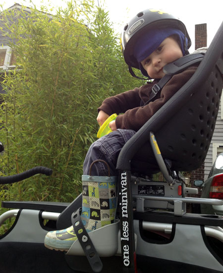 The Big Dummy is so great and I can’t believe how easy it is to take the seat off. I should bring it by for you to take a look at. Tell me when you’re at the shop (or use my contact form if you don’t want a bunch of Davey stalkers to show up, too :) Oh, my guys are almost-2.5 and 4.75. But they’re light, probably around 27 pounds and 37 pounds, so I’m lucky there. I think kids younger than 4 are probably often not in a seat, but it’s nice in case of unexpected nap or for holding snacks/toys/books instead of having to hold stoker bars.