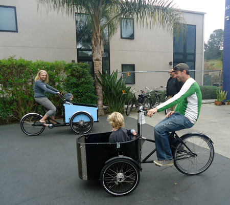 Zak of Bike Temecula and two of his kids met us there. He’s got a Metrofiets at home which sounds simply awesome. I’ll have to check them out on my next trip to Portland. Zak got pretty fancy on the Christiania (meaning he took the turns so fast I couldn’t watch), but kept all three wheels on the ground. I love the kooky handling of the Christiania, but kept it slow and cautious while Zak rode the Nihola.