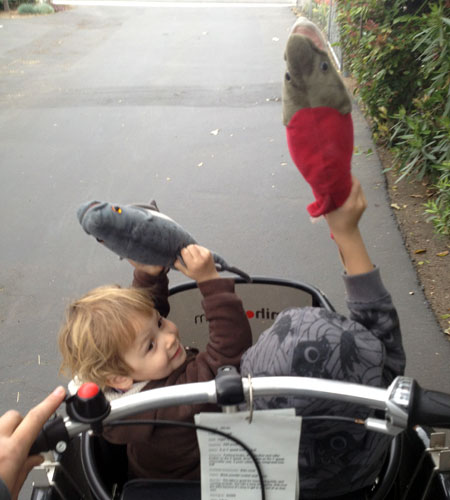 The boys were excited to finally get their turn on the Nihola. They love this trike so much–ever since our first visit to Clever Cycles when they rode with the shop [stuffed] dog.