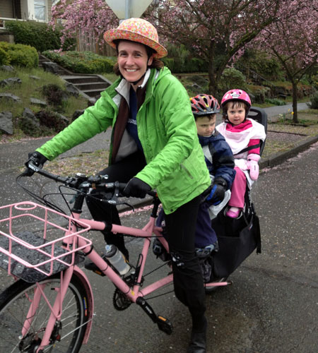 Hooray for the Internet. Two months ago, A Simple Six e-introduced me to Hum of the City so we could coordinate meeting in person today in Seattle. Having just spent a few rain-free days in Portland where she discovered the awesome BionX electric assist, it was only fitting for me to stick her on my plain ol’ Surly Big Dummy, lead her over some hills, and summon the rain to help cement the dream of upgrading to e-assist in her mind.