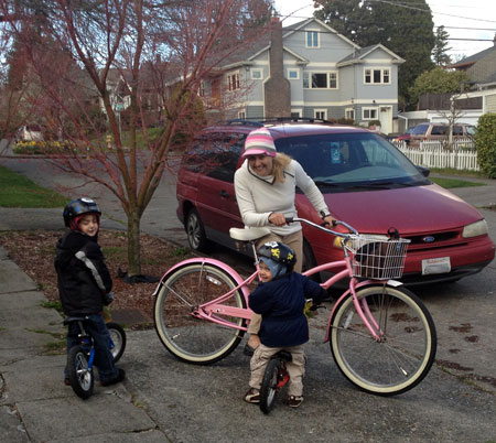 The timing was perfect because the clouds parted and the sun finally made an appearance–although an odd rain fell for a few minutes despite the clear skies. I needed AAA batteries for my new Bike Brightz (well, for the DVD player remote I stole batteries from) so I took the beach cruiser, a GT/Dyno Bikes Kustom Kruiser Kozmopolitan. Mr. Family Ride got it for me when we lived in San Diego where it was my primary bike and it’s not as useful here in hilly Seattle, but I just love this bike. And all the kid carrying has made me strong enough to ride it in Seattle. I really should clean it off and take it to the beach for a nice photo set, but in the meantime, here it is in its grimy splendor:
