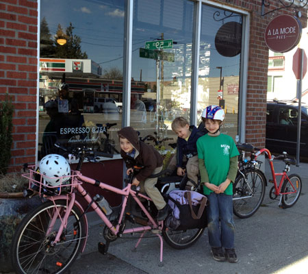 In the meantime, I’m in training: biking then pie-eating. Today’s training ride was a couple miles–uphill, that’s crucial–to West Woodland Park Playground to meet up with Jen of Ballard Greenways and her friend who is in the process of getting her mountain bike turned into an Xtracycle by LionTail Cycles. Jen rides with her son using a Burley Piccolo trailercycle, which has gears and is very stable, unlike cheapie trailer bikes. It’s a wonderful way to attach one kid behind the back of a bike.