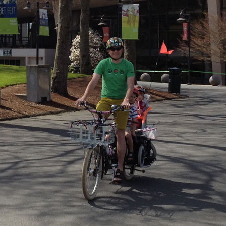 We didn’t stay in the Children’s Museum for long, but it was very convenient to have checked in and gotten hand stamps so we could rush back over for a few bathroom breaks over the course of the day. Biking with Brad and kids (and their balance bikes since he always seems to show up with more impressive loads than I!) met us at the International Fountain where the kids could run around on the grass and in the fountain. Brad played cargo bike ambassador and assisted a mom of two in a test ride of my bike. He doesn’t realize last month’s visit from Hum of the City was the first time I’ve shared a bikey toy. But I’m learning to be better about that.
