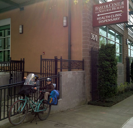 After the doctor, we rode two blocks to the Bastyr Dispensary for some $11 cough tincture he refuses to take. Grr. But what a cool place! I’d never been so when I didn’t see a bike rack on the sidewalk, I just locked up to the front fence. I think there’s probably a bike rack below in the parking garage. The place is full of non prescription stuff so it’s nice to know I don’t have to go uphill to Whole Foods or as far downhill to PCC to get medicines. If you clicked to their site you probably noticed the Medical cannabis is NOT available at Bastyr dispensaries. But they were well-equipped for the medical munchies, with many chocolate options and even frozen burritos.