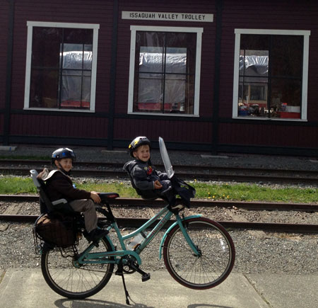 This was our first big day out with the new Hebie kickstand. It’s high! It works great, but we’re all getting used to how high it props the front wheel. And I should point out that unless on have a cargo bike with Rolling Jackass center stand or similar, you should not leave your kids on the bike–even for quick pictures. While my bike has never toppled over during the shooting of a photo, I have dropped it before, and it’s not fun to have to pick back up (for any of us).