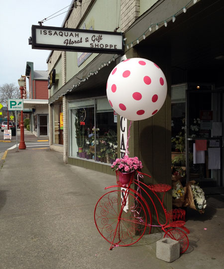 On the ride to the dentist the boys were wowed by a very large balloon tied to a penny farthing plant stand outside Issaquah Floral & Gift Shoppe. I also noticed a real penny farthing outside Bicycle Center of Issaquah so I’ll have to put that on a future Issaquah itinerary. And that will guarantee another Kent sighting.
