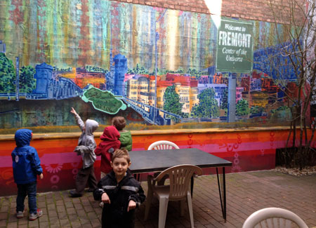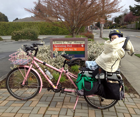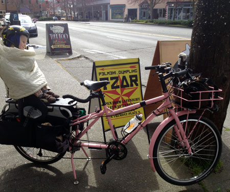 This was our first big day out with the new Hebie kickstand. It’s high! It works great, but we’re all getting used to how high it props the front wheel. And I should point out that unless on have a cargo bike with Rolling Jackass center stand or similar, you should not leave your kids on the bike–even for quick pictures. While my bike has never toppled over during the shooting of a photo, I have dropped it before, and it’s not fun to have to pick back up (for any of us).