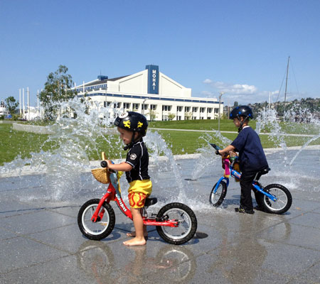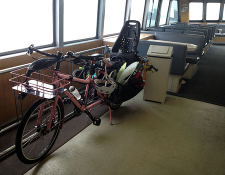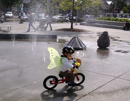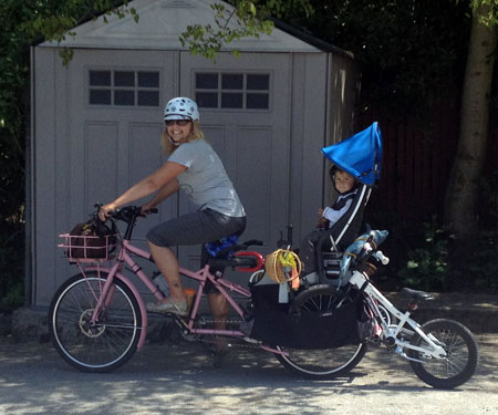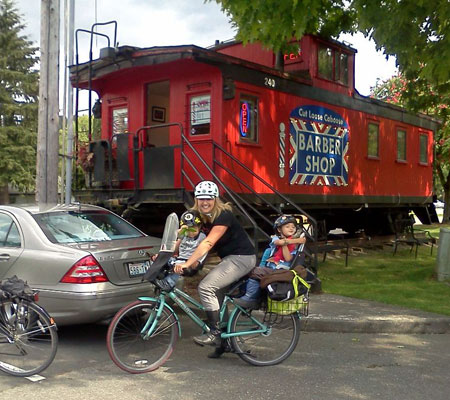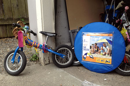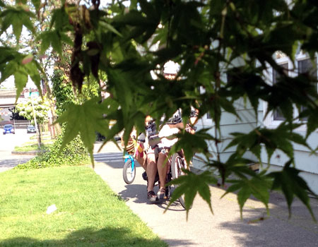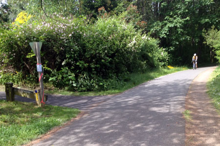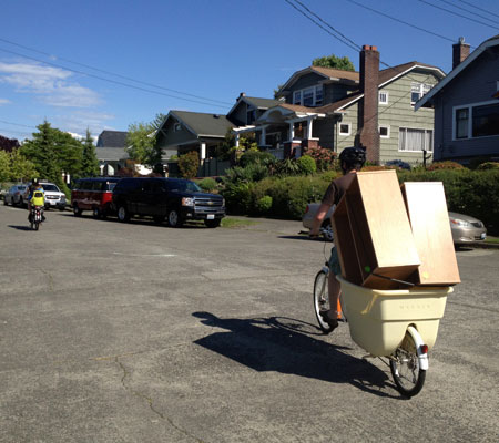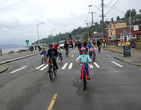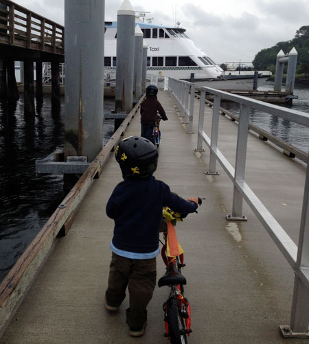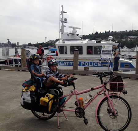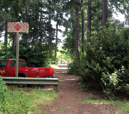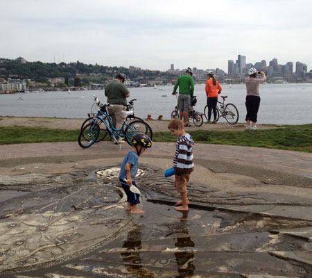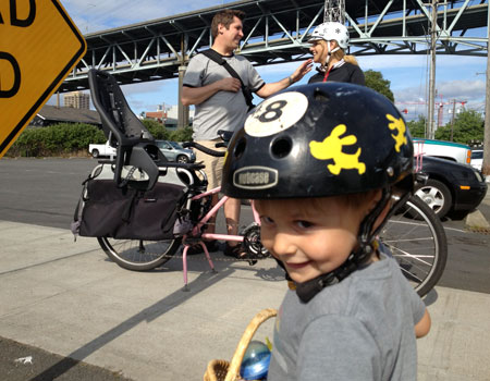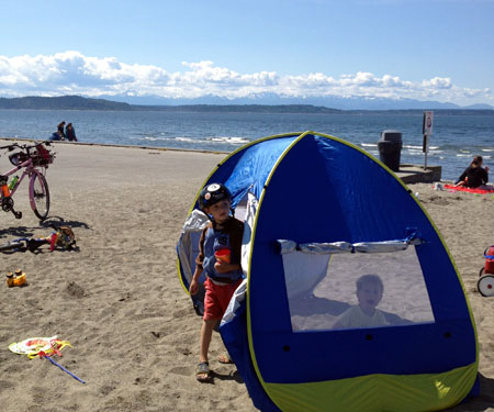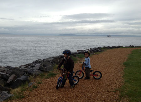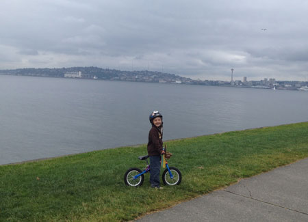 I had written off Lake City as too hilly and too dangerous to get to by bike, but I proved myself wrong today. Wednesday is usually our car day because we have twenty minutes to get from Lower Queen Anne to Lake City, but the five-year old stayed home from preschool so I took advantage of our extra open time and set out for a ten-mile adventure. Last year I biked to Wedgwood during the Burke-Gilman Trail closure so part of the trip was familiar…but not familiar enough for me to catch the left toward NE 94th St. I realized my mistake when we reached Matthews Beach. Here’s what the turn-off looks like for future reference:
