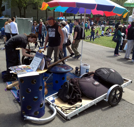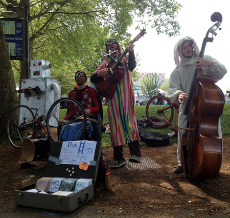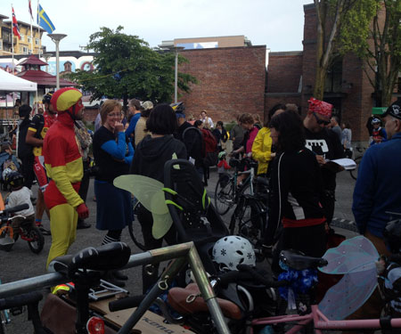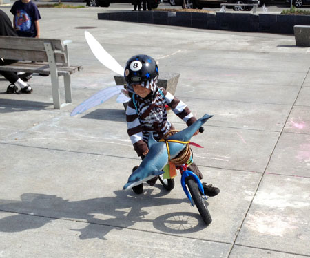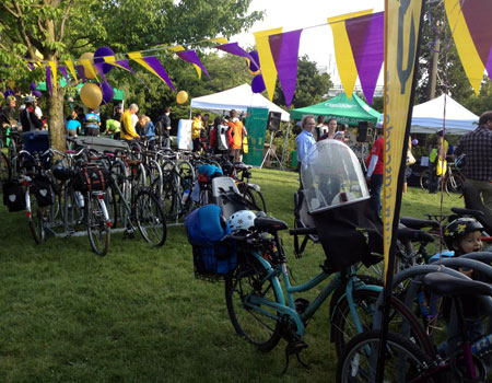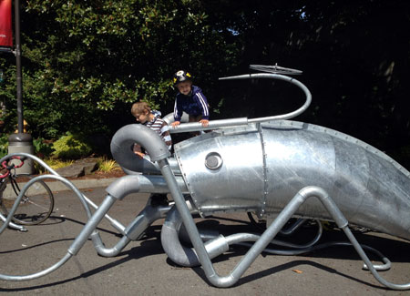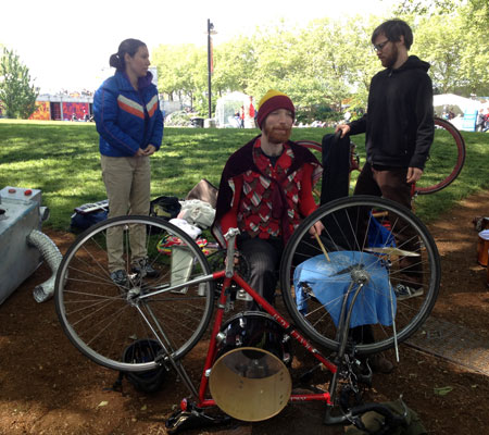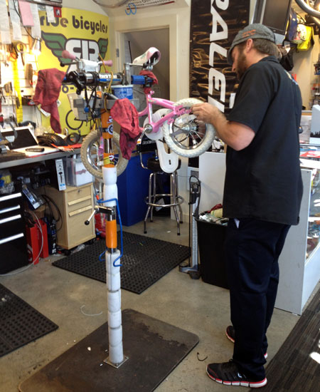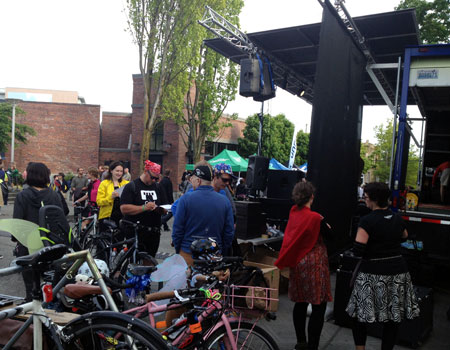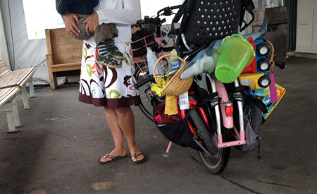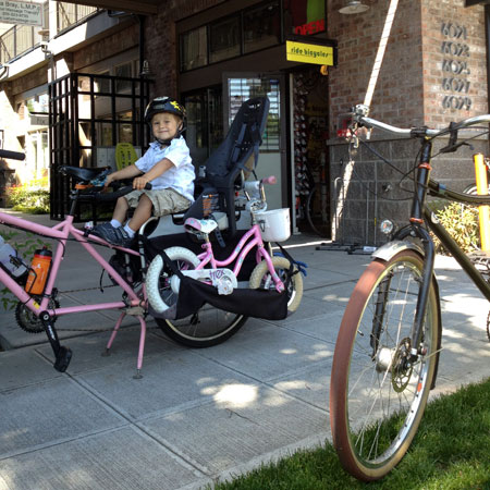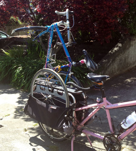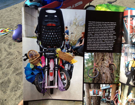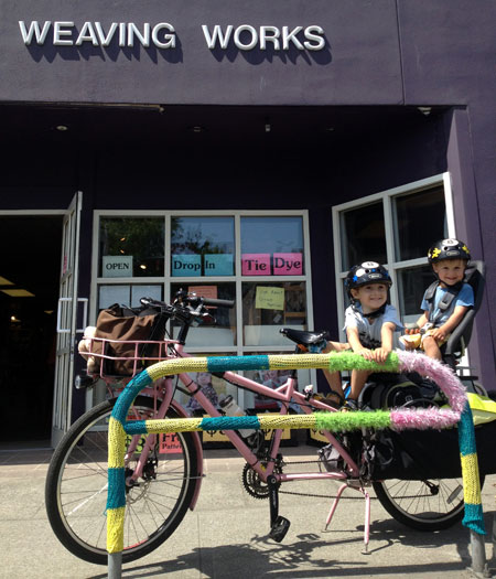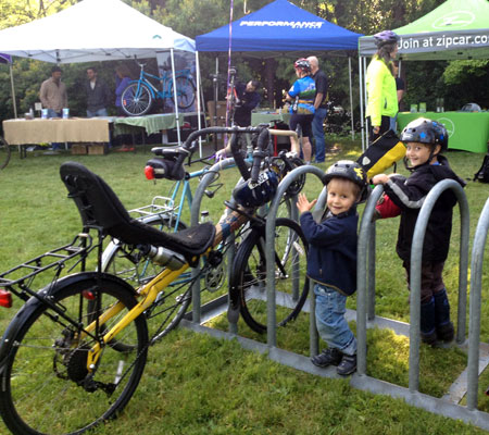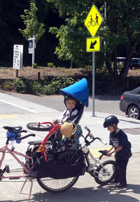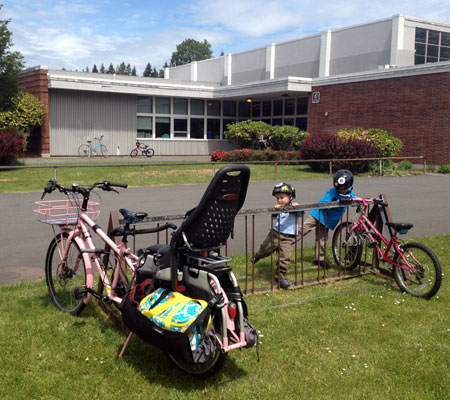Then it was a quick–and flat!–ride to Olympic Hills Elementary for class…after some bike rack aerobics. I’ve put both bike rack pictures on Hum of the City’s new Kids on Bike Racks Flickr group. Add yours, too!