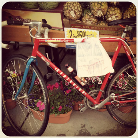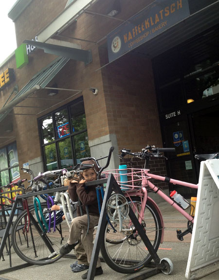 We went out early to have time to visit Kaffeeklatsch coffeehouse. I thought their custom bike rack would have been moved to the street by now, but it was still on the sidewalk. The barista said it’s getting bolted down next week, but she didn’t know if it’s permanent spot will be on the sidewalk or street. My bike’s too long for its current location so I hope it moves into street corral position.
