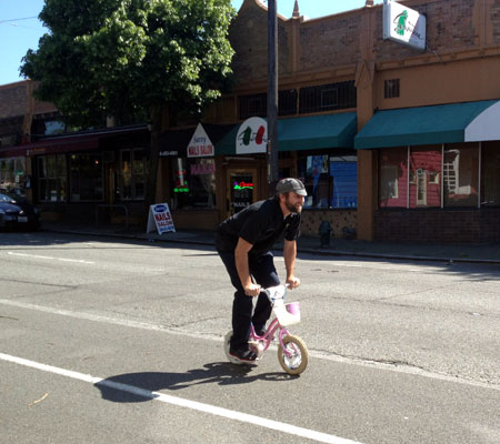 The steepest climb is up 94th away from the trail. I had to get out of the saddle, but I don’t remember having to walk it last time on the city bike so I declare it bikeable by all. There’s more climbing, too. The 35th Ave NE portion is a particularly unpleasant slog uphill. I think the best part is cresting the hill of NE 120th St and seeing the big green Vision Quest [Fitness Club] sign. I felt like Matthew Modine jogging into eighties-America’s heart.