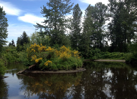 I think that was Hiram Place NE cutting through 26th Avenue NE. We also discovered Virgil Flaim Park for next time. It’s tiny, but it’s a playground at the top of all the hills. Sometimes a park halfway up the hill is good, but I think this trek requires a park at the top of the hill. Also, despite the address given on the City’s site, it’s really at NE 123rd Street and Hiram Place NE. Since we were headed downhill we stopped to explore a bit farther along, at Meadowbrook Pond. Such a beautiful spot! We’d cut through just the edge of the park on our way north, but we rode into the center and walked around the raised walkways and trails on our way home.