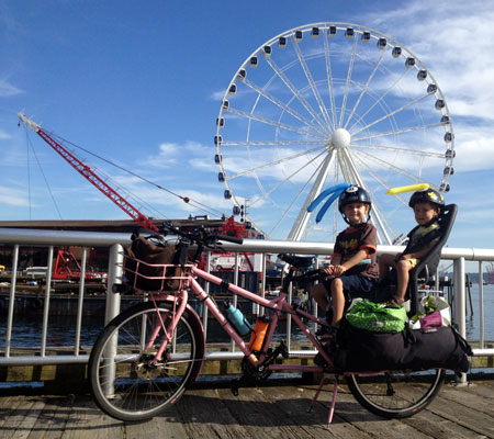 Unfortunately, I noticed my tire was a little low as I prepared to leave for preschool pickup. I’d somehow knocked off my valve cap and bent the valve in the course of the early afternoon, but I’m nothing if stubborn and impractical so I left the bike loaded with beach gear, pumped up the tire, and figured I’d come up with a flat-tire-backup-plan during the ride. My first thought was to have Mr. Family Ride pick up the kids from the beach if it flatted and I’d walk the bike to a bike shop, leave it there, and then catch the bus home. But then I had the much more reasonable idea to ride by Dutch Bike Co for a new tube.
